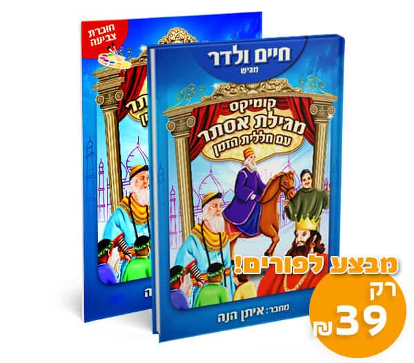 זהו חלום של כל אחד לטוס בחללית הזמן למרחבי ההיסטוריה, לראות איך זה באמת היה! הסבא עם נכדיו טסים לפרס ומדי ורואים איך הכל מתרחש, רואים את מרדכי ואסתר, את אחשורוש והמן, ואפילו את זרש. קומיקס משעשע ומרתק גם למבוגרים! מבצע לפורים! בכל רכישת ‘קומיקס מגילת אסתר עם חללית הזמן’ תקבלו במתנה גם חוברת צביעה לילדים של הקומיקס!